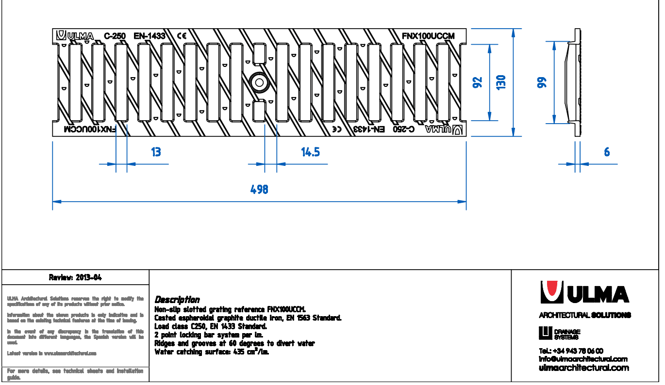 Ideal para sistemas de drenagem ULMA, a grelha FNX100UCCM combina funcionalidade, segurança e acabamento profissional.