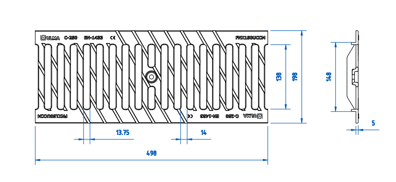 | Material: Fundição | Nervurada (Normal) | Classe de Carga: C-250 | Ref: FNX150UCCM | Fixação: mediante 2 cancelas e 2 parafusos por ML |