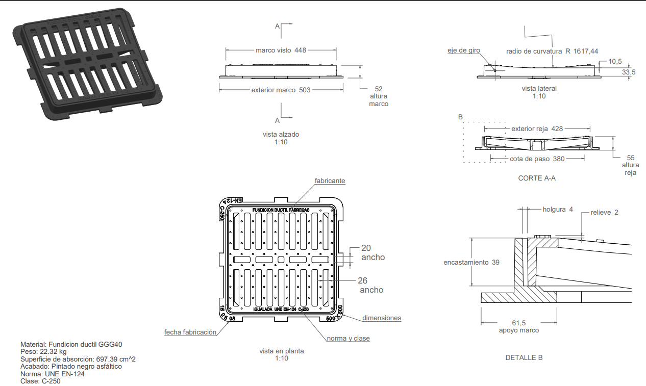 Grelha Fundida 50x50cm D-12C C-250 Fabregas em ferro fundido dúctil de alta resistência, projetada para escoamento de águas pluviais em zonas urbanas e industriais. Possui estrutura plana e reforçada, garantindo elevada durabilidade e desempenho sob cargas moderadas a pesadas.